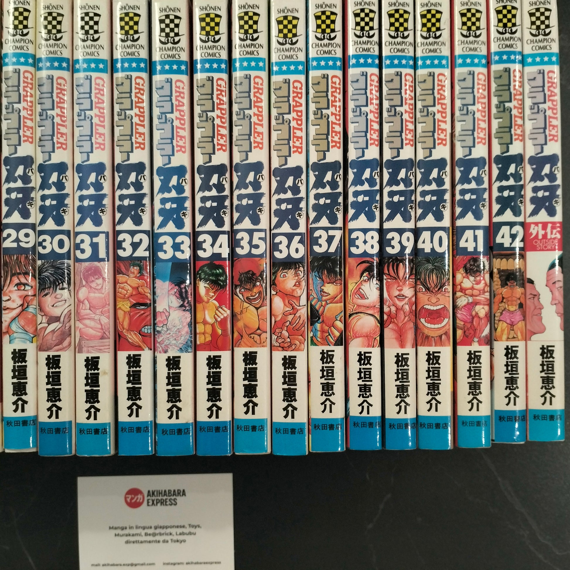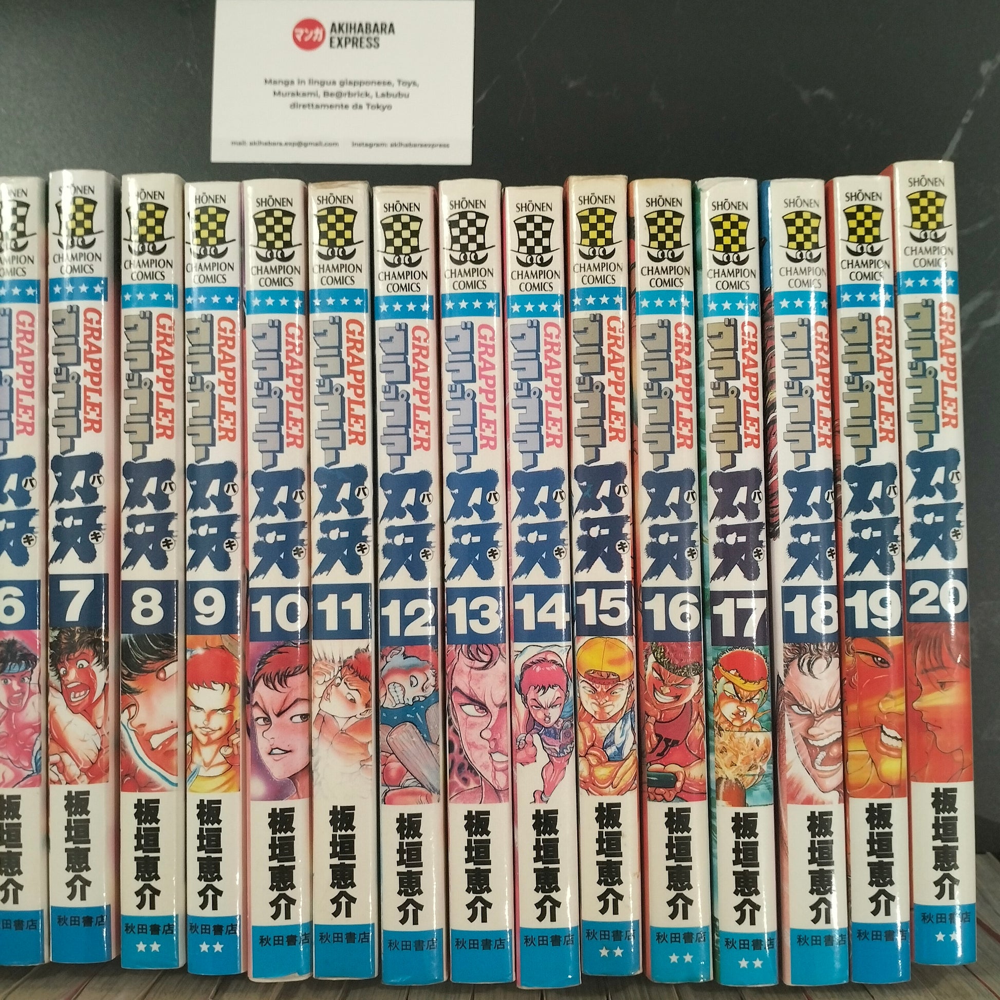 Serie completa Grappler Baki グラップラー刃牙 di Keisuke Itagaki, prima edizione giapponese edita da Shonen Champion Comics. Composta da 42 volumi + il volume speciale Grappler Baki Gaiden グラップラー刃牙外伝 ambientato dopo la fine del Torneo Massimo. Serie mai interamente pubblicata fuori dal Giappone.
