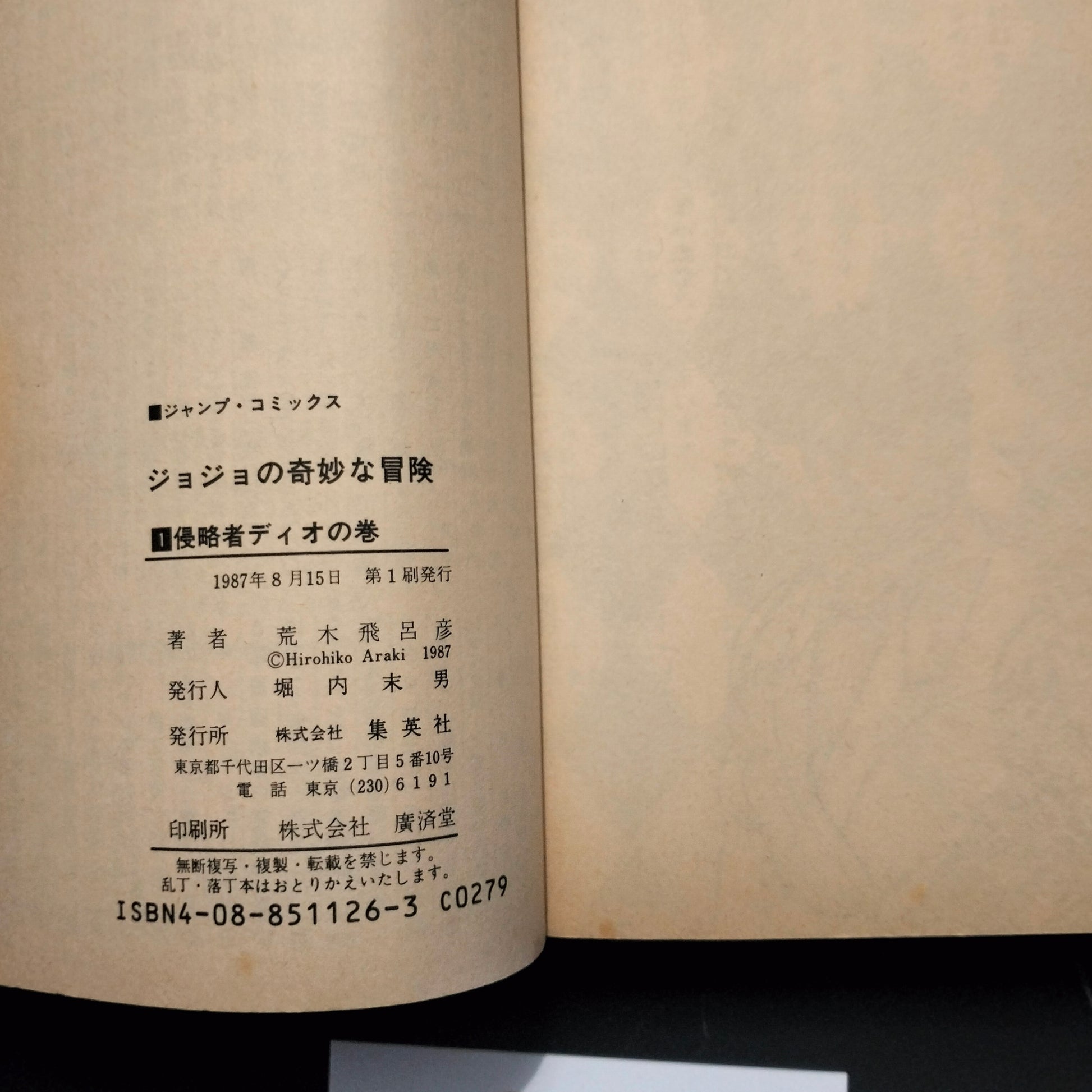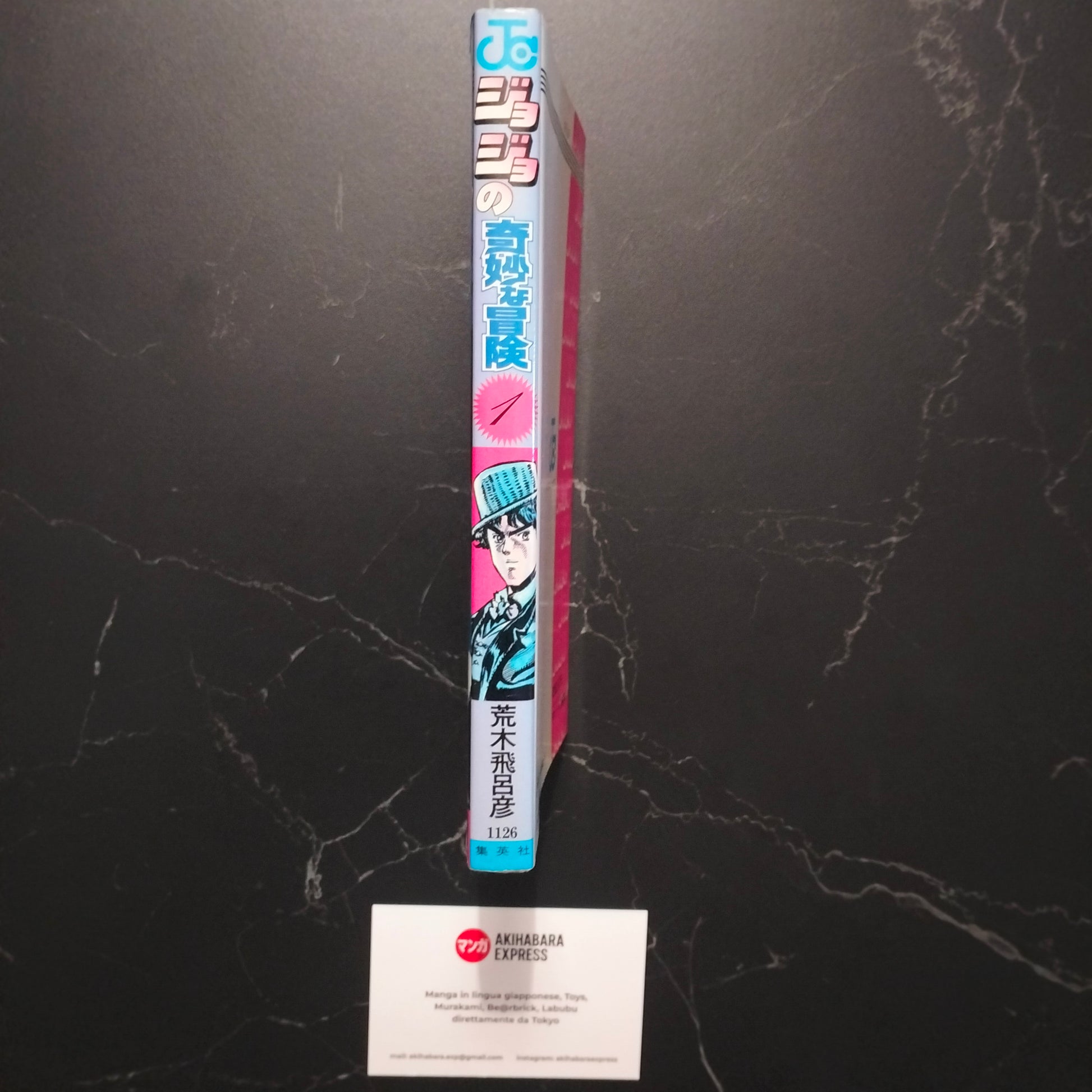 Rarissimo volume 1 del manga JoJo's Bizarre Adventure ジョジョの奇妙な冒険, prima edizione della Shueisha, e prima stampa emessa del 1987. Di Hirohiko Araki, il capolavoro che ha rivoluzionato il manga shonen. Trovato nel cuore di Akihabara, dopo una lunga caccia tra scaffali dimenticati!