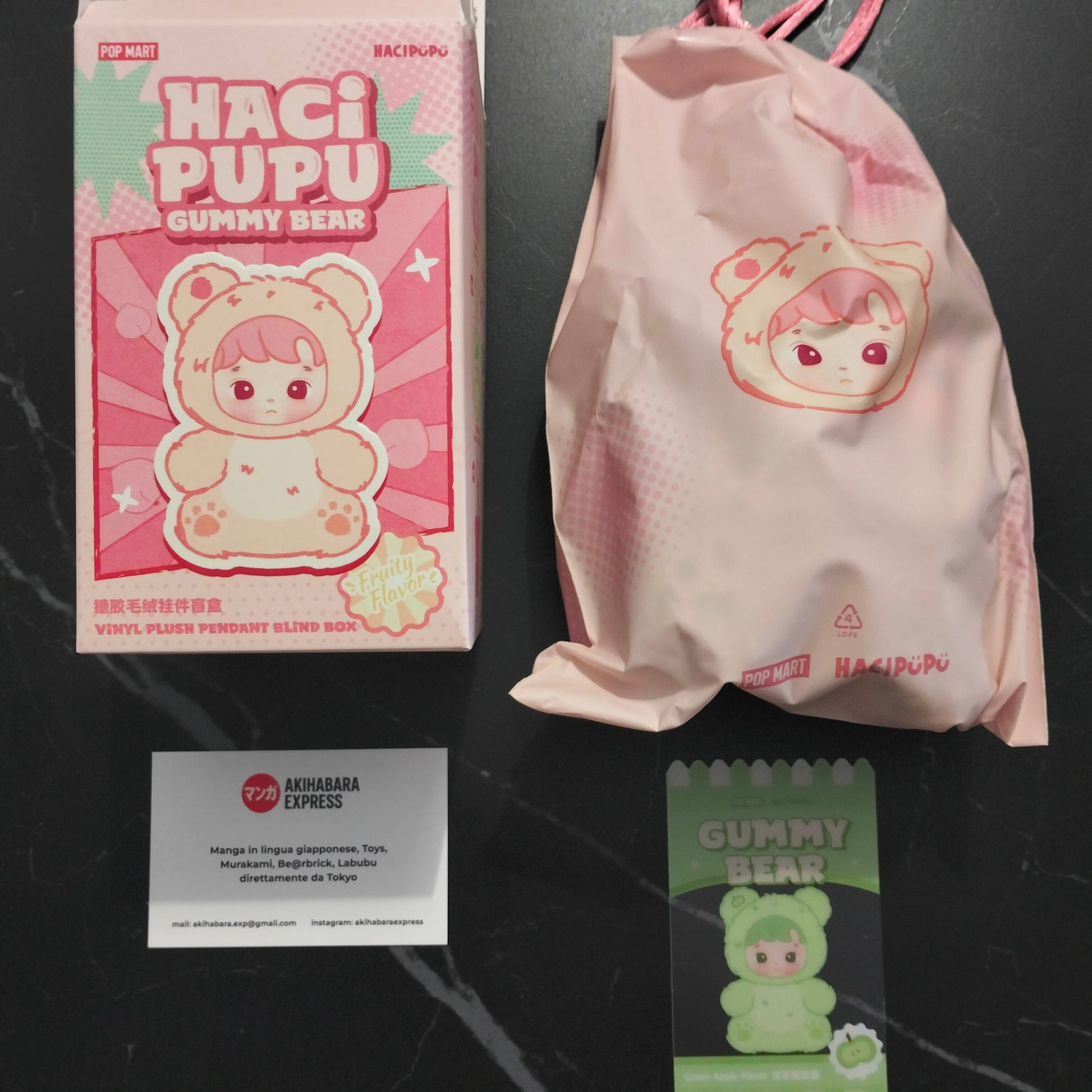 Hacipupu Green Apple Flavor della serie Hacipupu Gummy Bear firmata Pop Mart, acquistato direttamente presso lo store ufficiale Pop Mart di Milano.