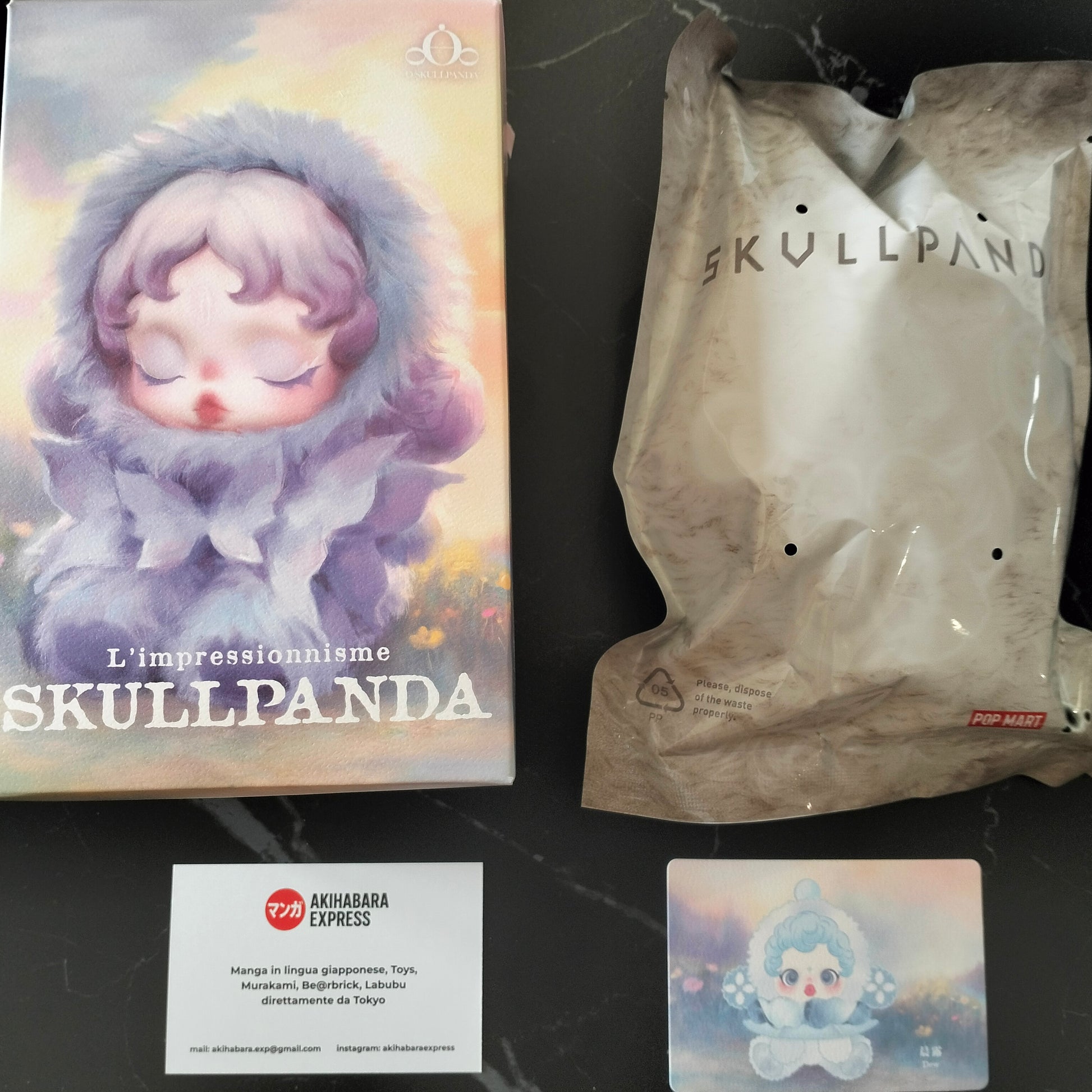 Skullpanda Dew dalla serie Skullpanda l'Impressionnisme firmata Pop Mart, acquistata direttamente presso lo store ufficiale Pop Mart di Milano lm